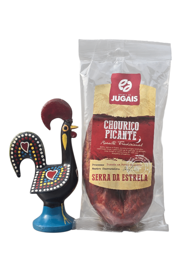 Quinta de Jugais werd in 2001 opgericht door twee broers uit Oliveira do Hospital, aan de voet van de Serra da Estrela. Het hoogste gebergte van Portugal heeft een lange traditie van vleeswaren, en Quinta de Jugais bouwt daar op voort met dezelfde recepten en dezelfde aanpak als de generaties vóór hen ook deden. Goed vlees, traditionele kruiding en geen concessies aan het proces. Inmiddels exporteert het bedrijf naar meer dan veertig landen, maar de Serra da Estrela chouriço picante smaakt nog precies zoals hij altijd gesmaakt heeft.